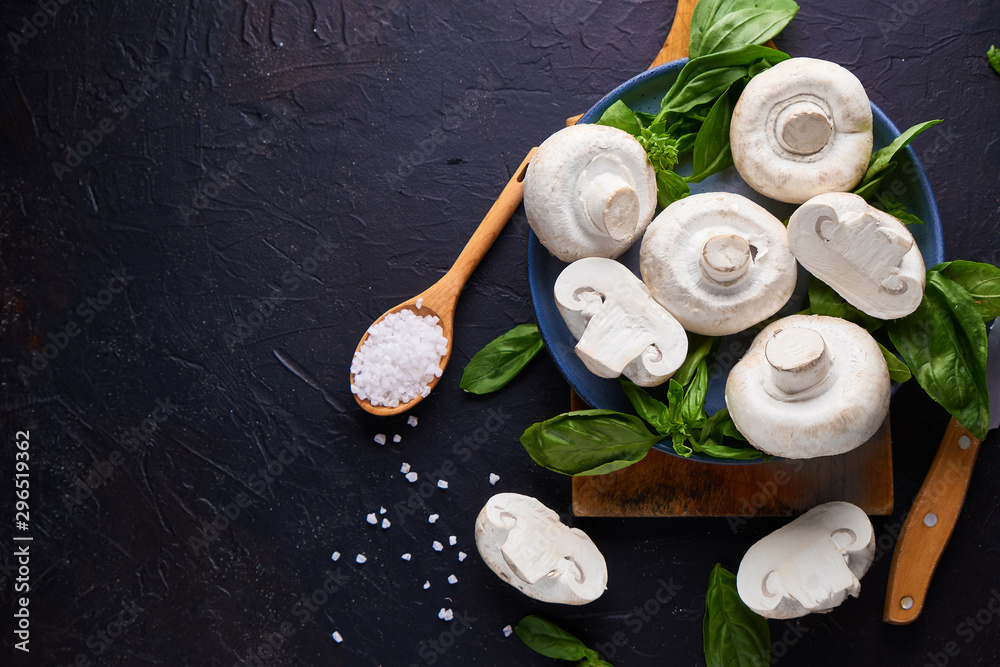 portobello white mushrooms Large champignon with basil in plate on dark stone background Copy space