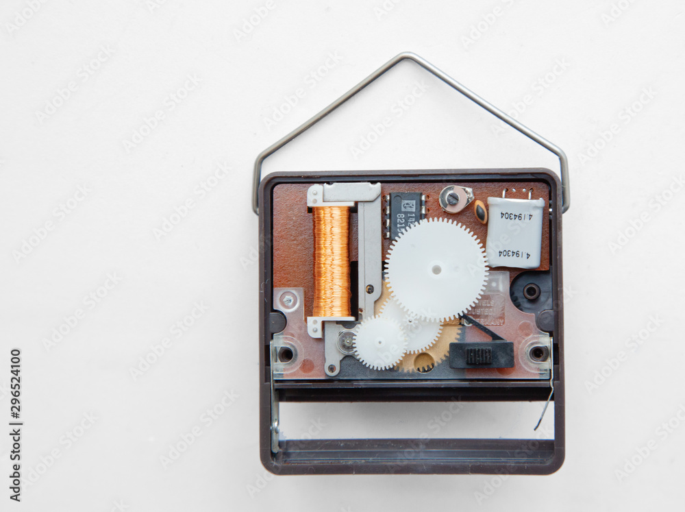 Innenansicht eines Quartz Uhrwerkes einer Wanduhr Tischuhr für Batterie mit Zahrädern und Magnet Spule