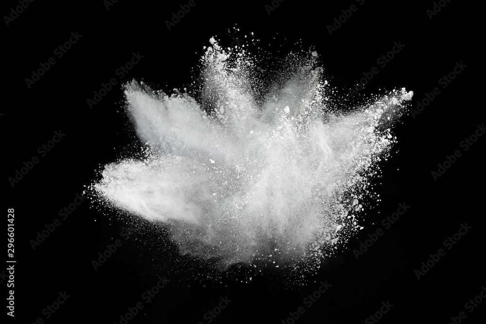 White powder explosion on black background. Colored cloud. Colorful dust explode. Paint Holi.