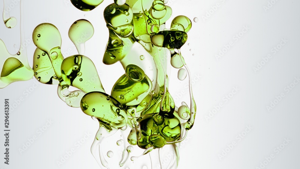 transparent green oil bubbles and fluid shapes in purified water on a white gradient background. Side angle with crystal colored bubbles in purified water cosmetic backdrop with copy space for science