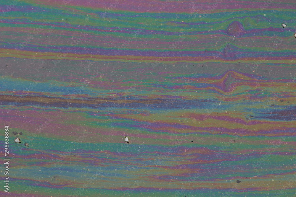 An iridescent gasoline film with small snow grains in it on the surface of an asphalt road