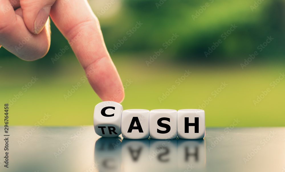 From trash to cash. Hand turns a dice and changes the word "trash" to "cash".