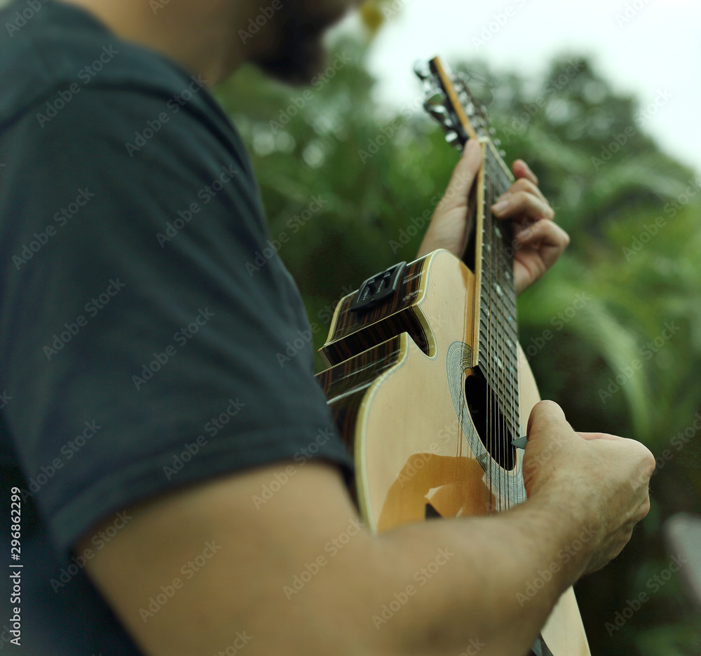 A puerto rican man playing the cuatro. A Puerto Rico national string instrument.