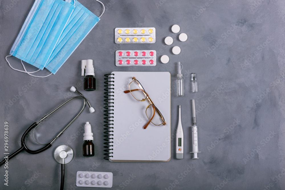 Medicine instruments, tablets and other medicines on a grey background. Top view.