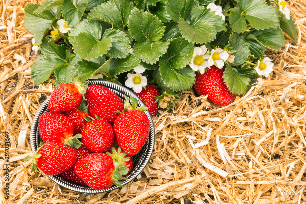 ripe strawberries in bowl with strawberry plant growing in organic garden