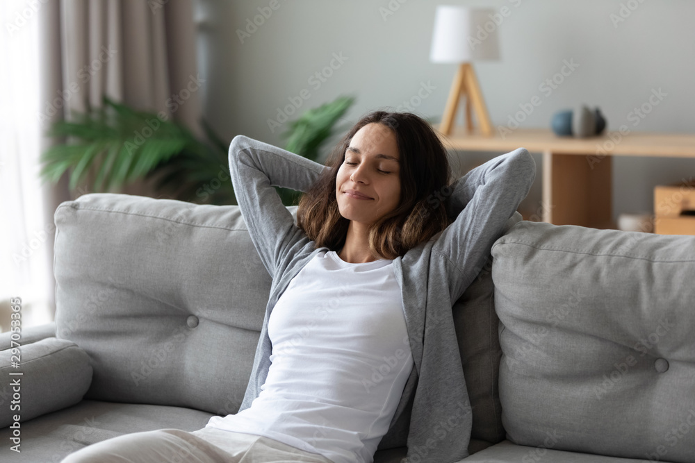 Tranquil smiling biracial millennial woman leaning on sofa.
