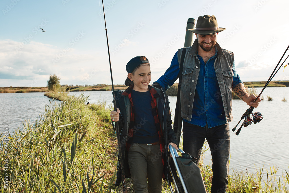 Adult father and teen son smile, go on island in lake look for fishig place. They carry fishing rods. Warm and sunny day.