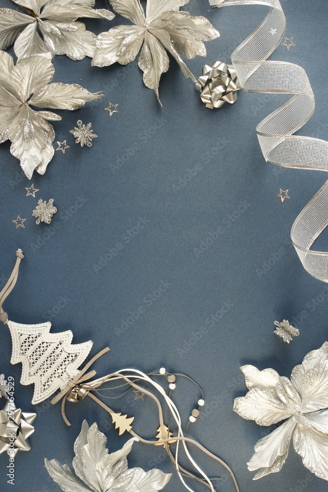 Christmas background. Xmas or new year white silver color decorations on blue gray background with empty copy space for text. holiday and celebration concept for postcard or invitation. top view