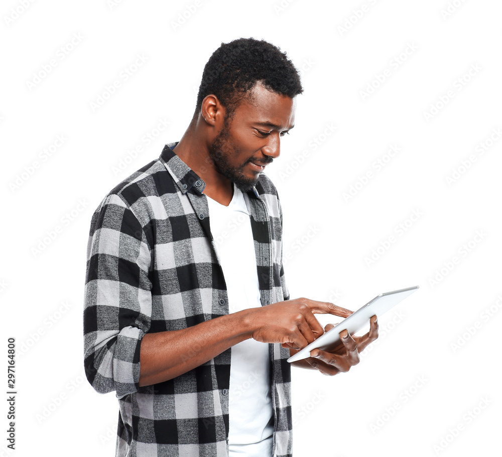 Portrait of handsome African-American man with tablet computer on white background