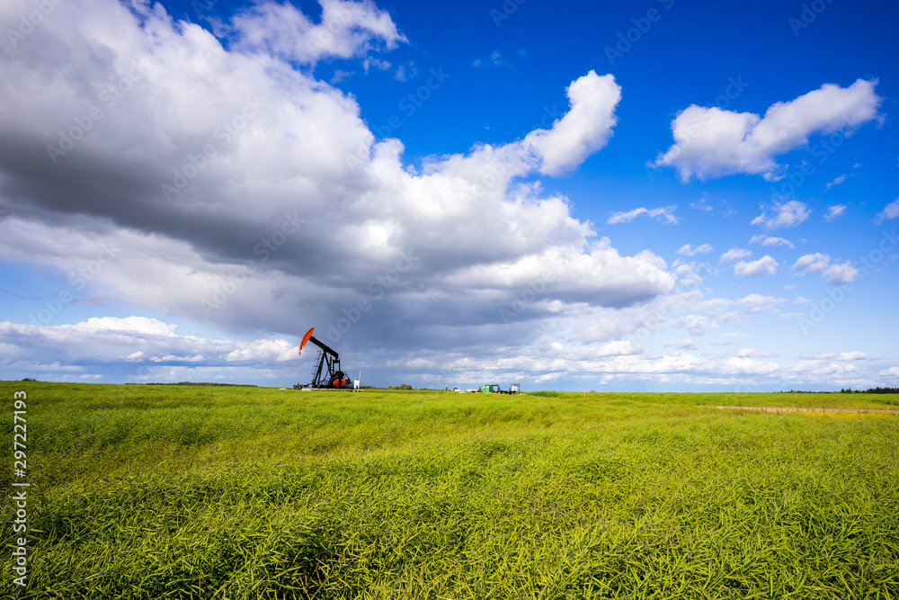 Oil Pumpjack in the middle of green canola field