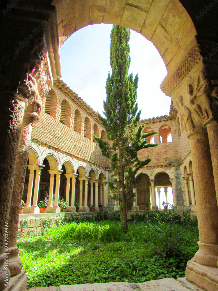 courtyard garden of a medieval Maria Collegiate Church in Alquezar, Aragon, Spain