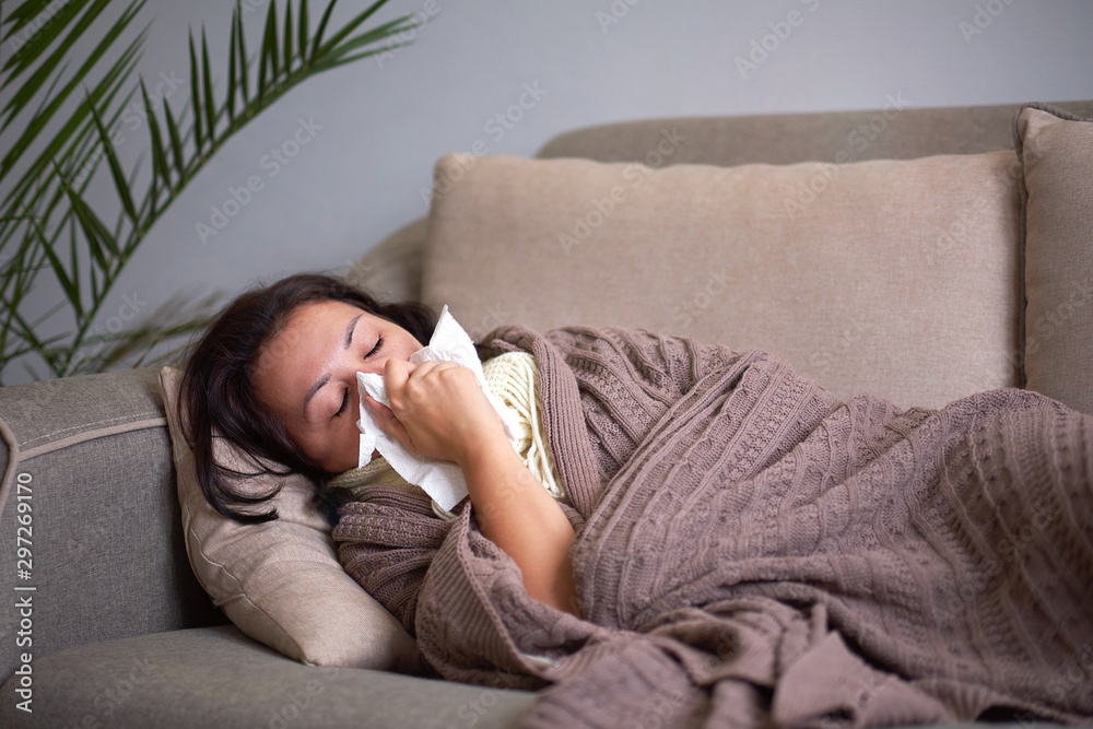 Ill upset woman blowing running nose got flu caught cold sneezing in tissue sit on sofa, sick girlsore throat, gray with a scarf throat and drinks aspirin at home, hay fever concept