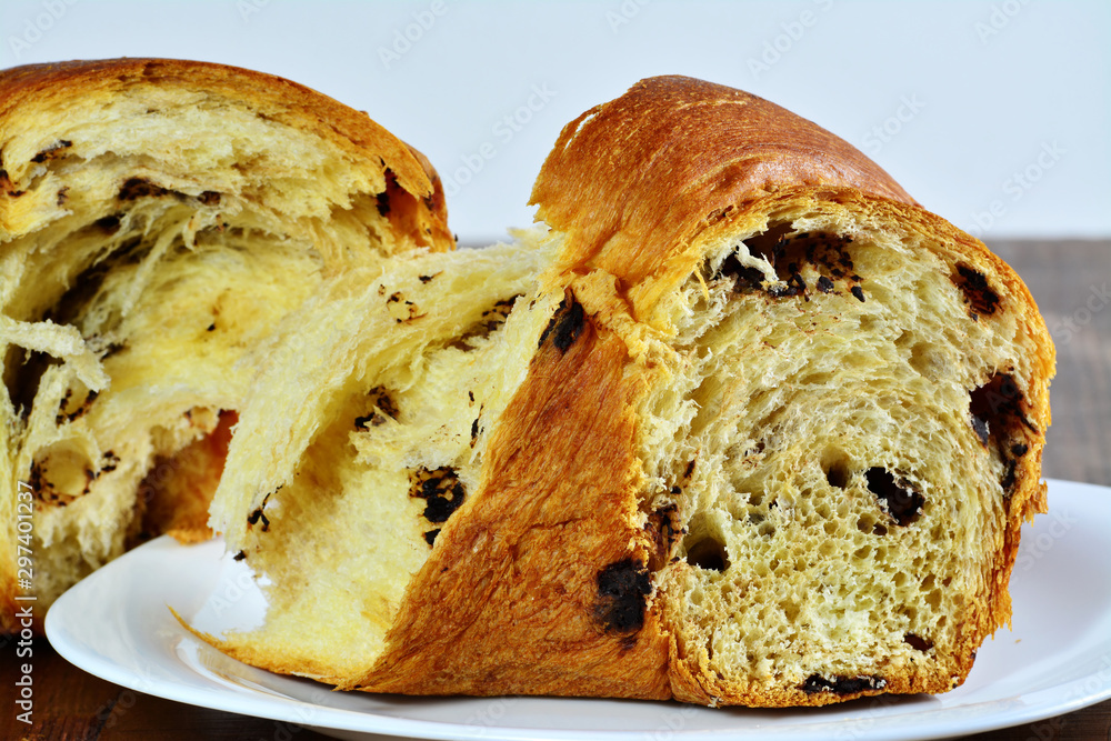 Brioche with chocolate chips broken in two pieces on white plate. Soft, tender, fluffy loaf of sweet yeast bread with dark, golden and flaky crust.