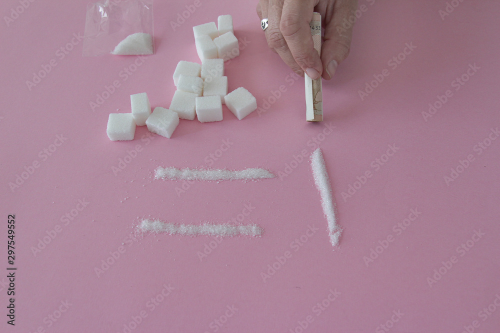 Sugar is a drug. Hand of a woman with sugar imitating cocaine
