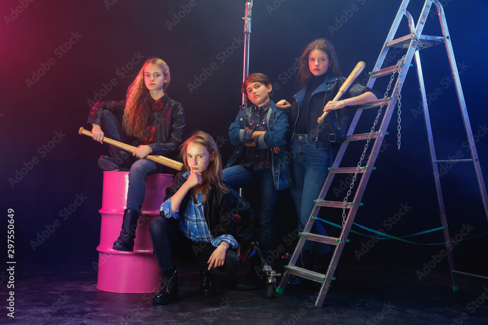 Rebel youth. Full length portrait of cocky children in stylish jeans and leather clothes. Concept of teenage riot, kids fashion, nonconformism and young energy. Modern lifestyle.