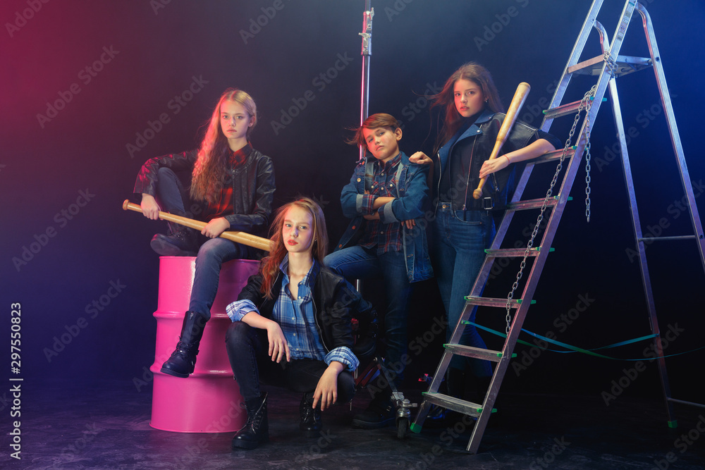 Rebel youth. Full length portrait of cocky children in stylish jeans and leather clothes. Concept of teenage riot, kids fashion, nonconformism and young energy. Modern lifestyle.