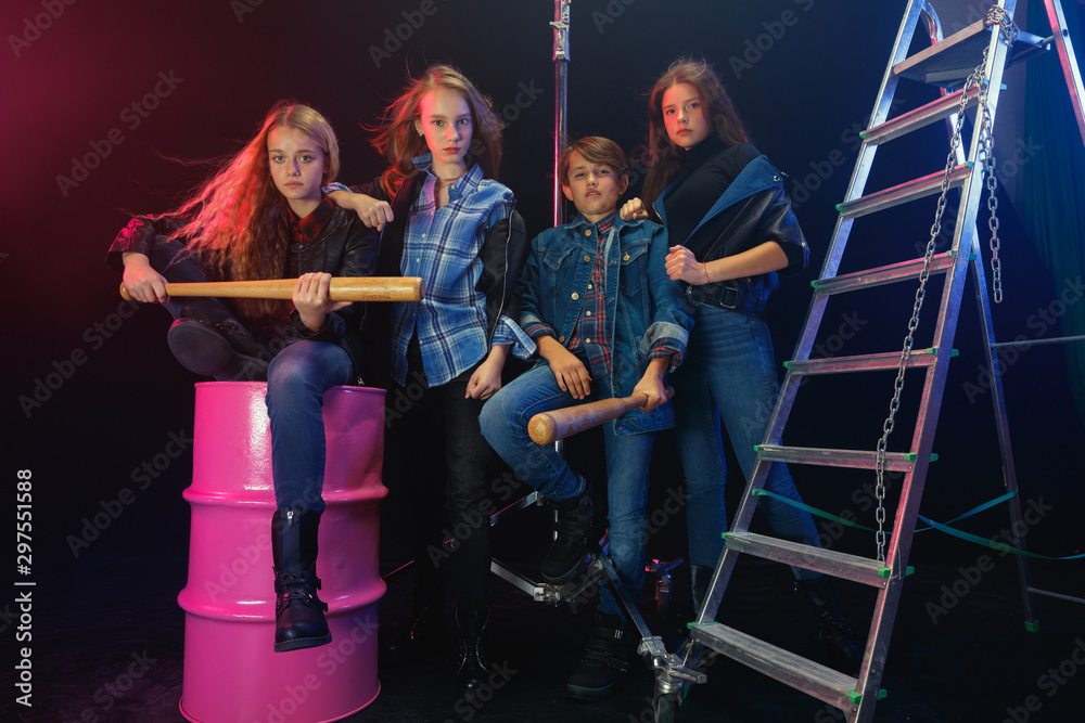 Rebel youth. Full length portrait of cocky children in stylish jeans and leather clothes. Concept of teenage riot, kids fashion, nonconformism and young energy. Modern lifestyle.