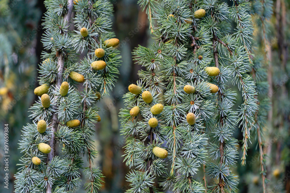 Close-up of branches and cones of Majestic Weeping Blue Atlas cedar (Cedrus atlantica Glauca Pendula in Crimea.