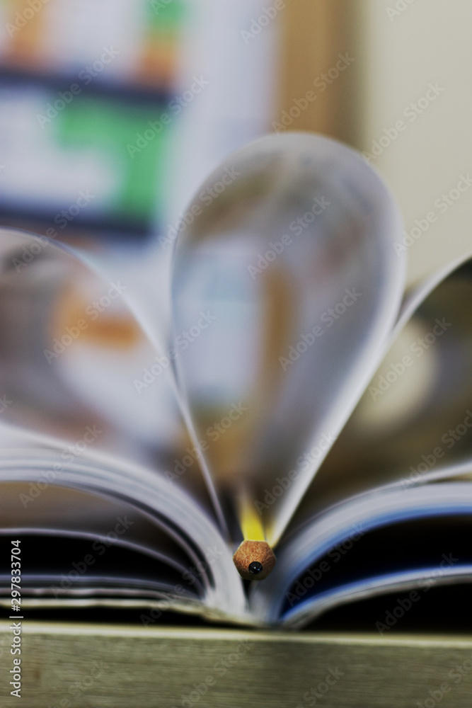 In the middle of an open book background, folded pages in the shape of heart, and pencil