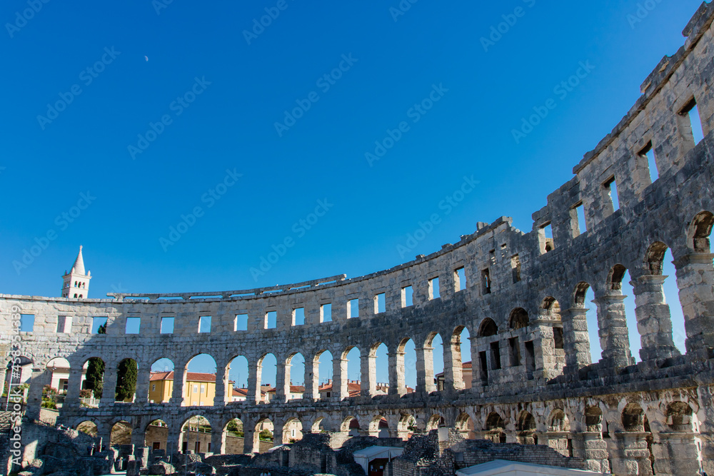 Romantic travel location, picturesque paved old narrow stone street in the Old Town of Rovinj, Croatia. Europe.