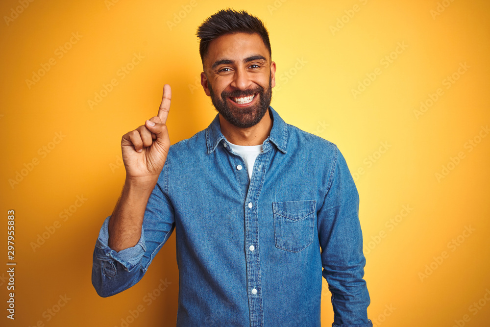 Young indian man wearing denim shirt standing over isolated yellow background showing and pointing up with finger number one while smiling confident and happy.