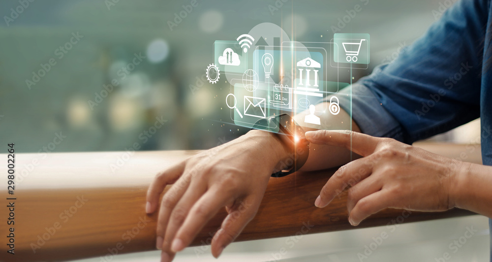 Man touching smartwatch on virtual interface for business and lifestyle, digital life and technology concept.