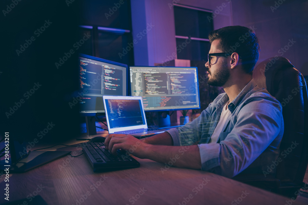 Profile side view portrait of his he nice attractive skilled smart focused concentrated guy consultant writing script creating new digital desktop app in dark room workplace station indoors