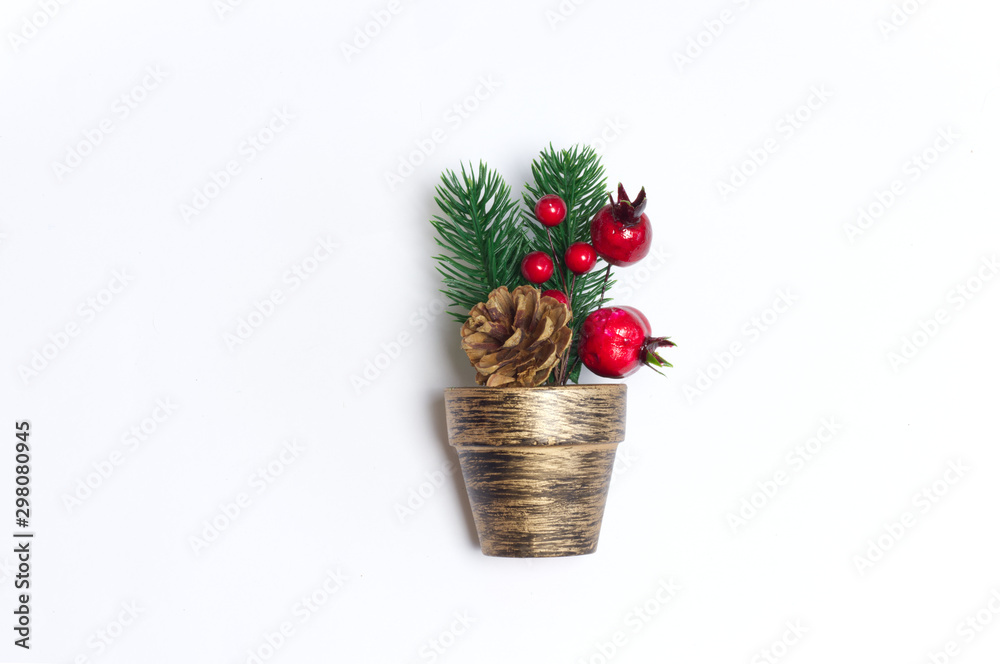 Christmas composition. fir tree branches, red decorations on white background. Christmas, winter, new year concept. Flat lay, top view, copy space