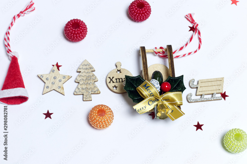Christmas composition. Gifts, fir tree branches, red decorations on white background. Christmas, winter, new year concept. Flat lay, top view, copy space