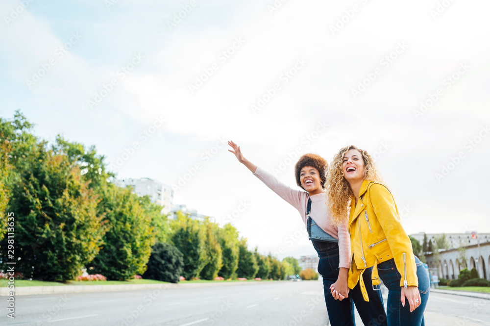 Loving lesbian calling a taxi at the street. LGTB concept