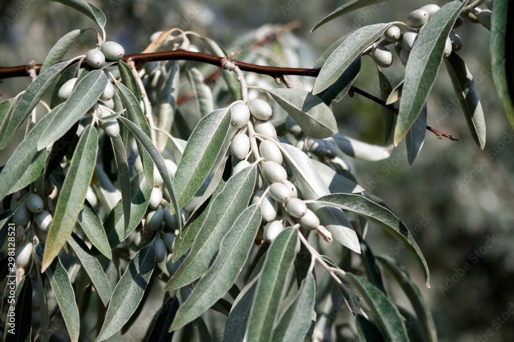 Closeup of Elaeagnus angustifolia branch (commonly called Russian olive, silver berry, oleaster, Persian olive, or wild olive)