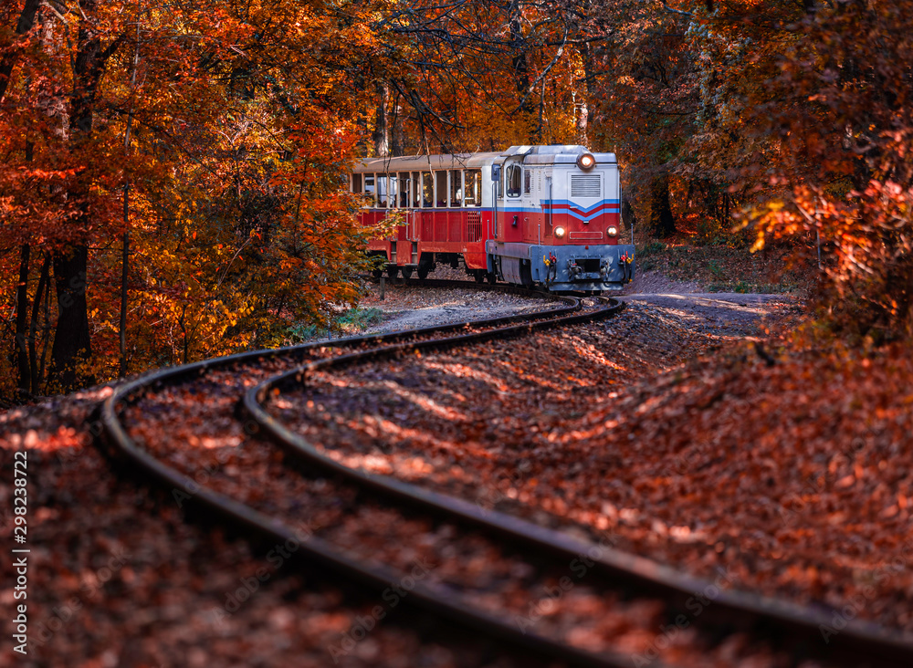 Budapest, Hungary - Beautiful autumn scenery with the Children's train on the S curve track in the Hungarian woods of Huvosvolgy with colorful orange and red colored autumn forest and foliage