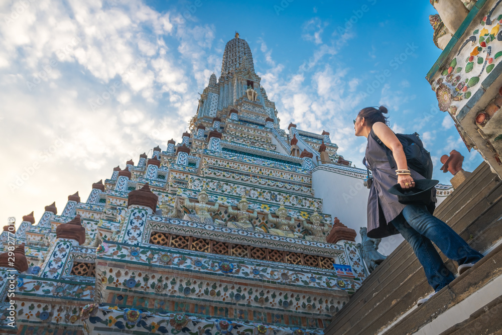 Traveler woman looking pagoda temple unique attractions in Wat Arun, Popular famous landmark travel Bangkok Thailand, Tourist female on holiday vacation trips, Tourism beautiful destination place Asia