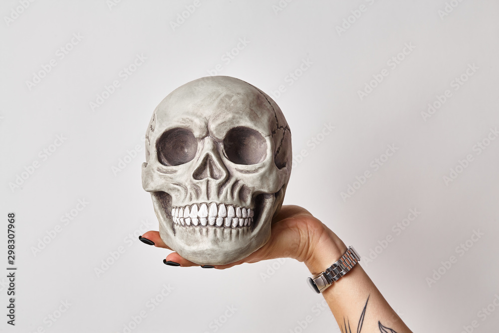 Tattooed hand of a woman in a black watch is holding a realistic model of a human skull with teeth isolated on white. Close-up shot.