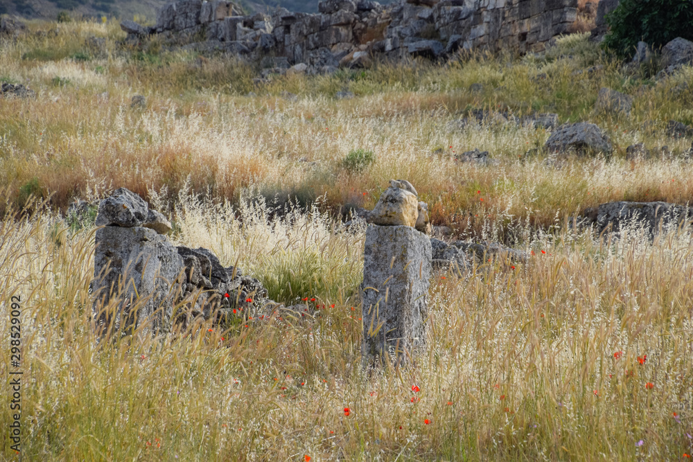 Antique ruins and limestone blocks in Hierapolis, Turkey. Ancient city.