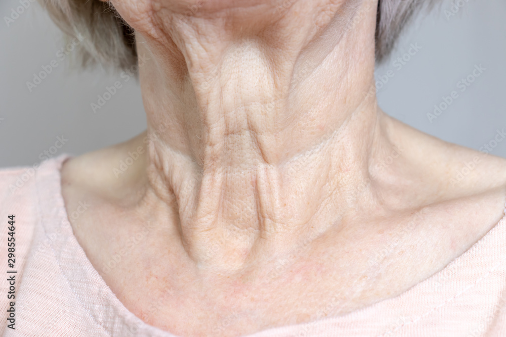 A flabby wrinkled excess skin on the neck of a senior woman close up