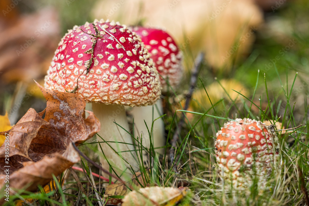 close up of couple red spotted toadstool mushrooms with half dome shaped cap grown on fall leaves filled green grass field with blurry background