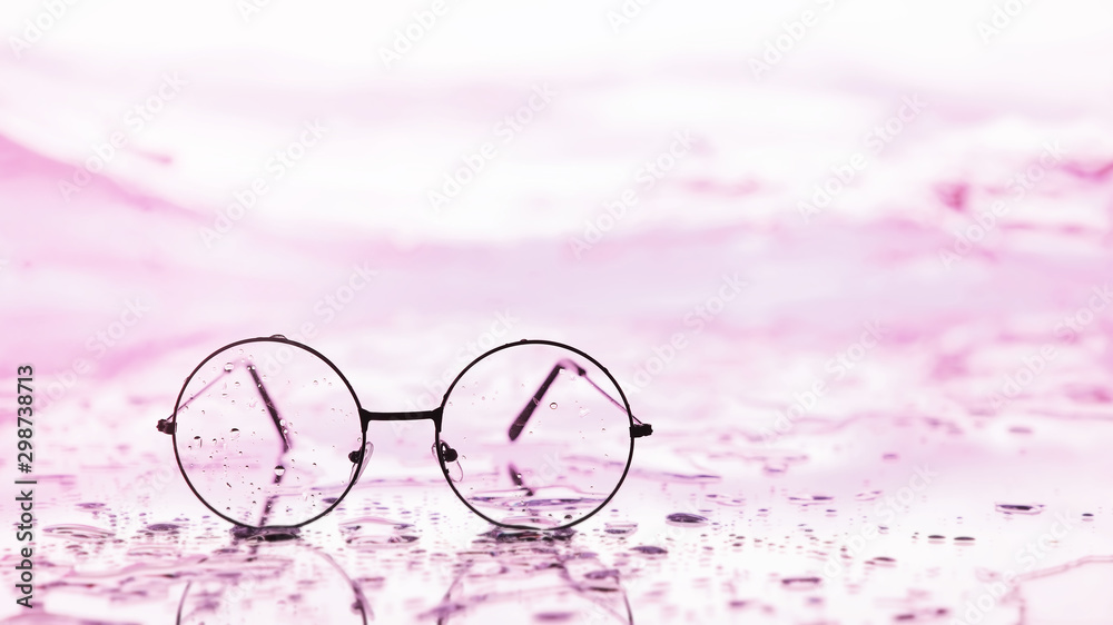 Tools for vision correction. Glasses and lenses with diopters on the background of splashes and blurry.