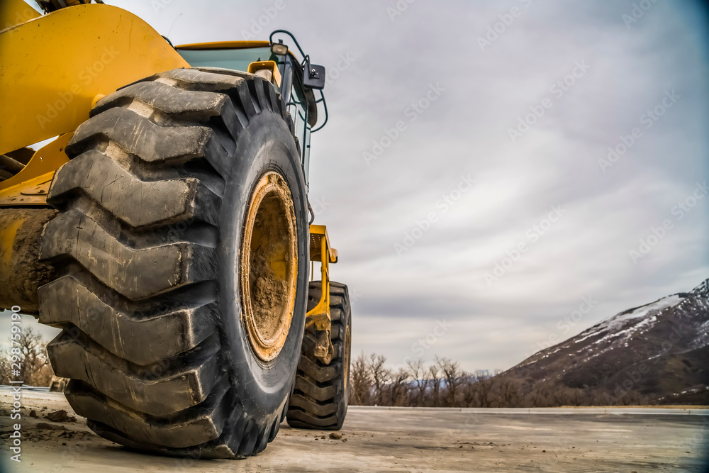 Focus on the black rubber tires of a yelow bulldozer at a construction site