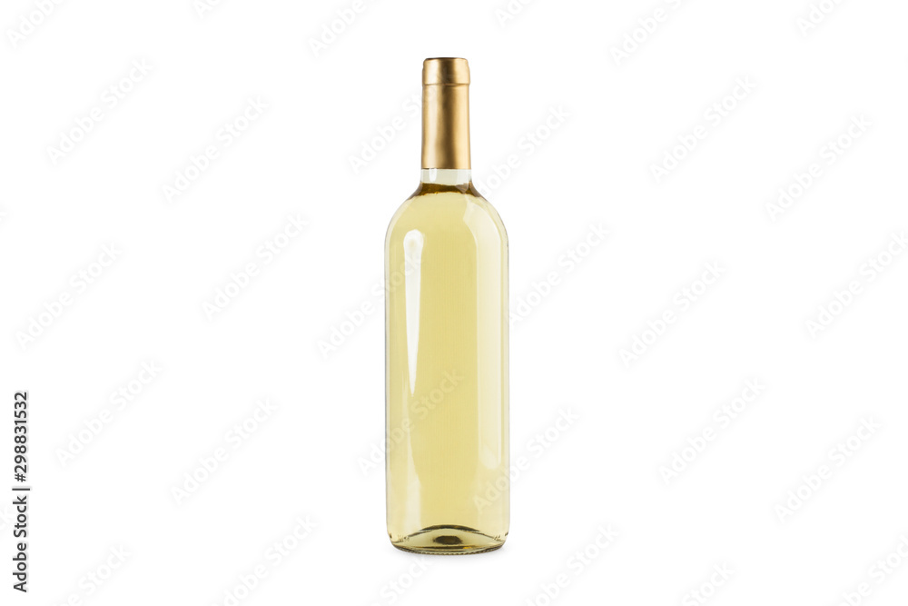 Botella de vino blanco sobre fondo blanco aislado. Vista de frente. Copy space