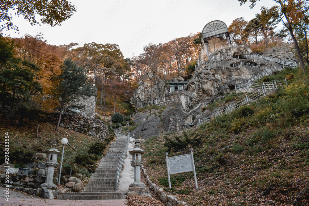 Golgulsa temple South Korea staircase on a rock leading to a buddha statue carved in a mountain
