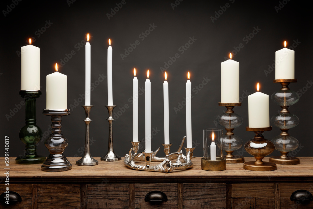 A group of candle sticks and glowing candles, shot on a wooden table, with a dark grey background