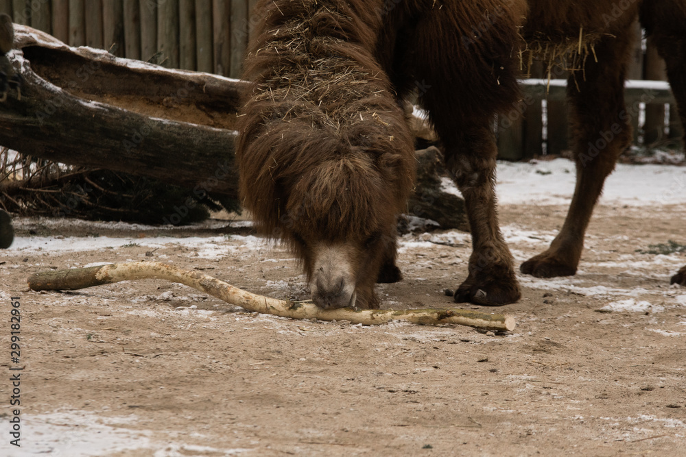 Bactrian camel with wooden branch
