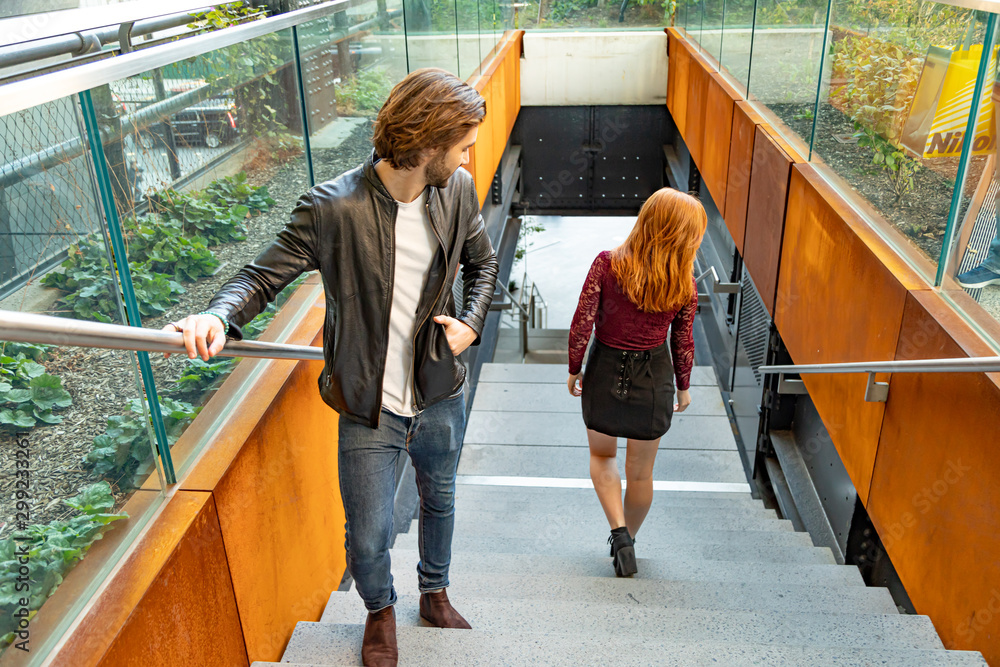Man checking out woman after they passed on stairs