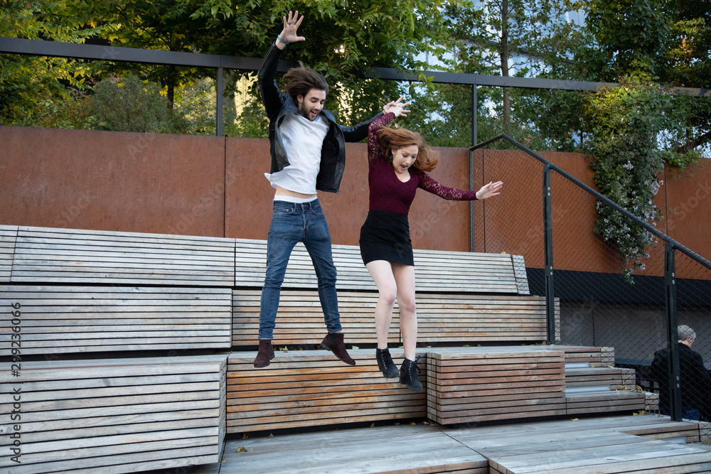 Couple jumping off of park ledge together 3