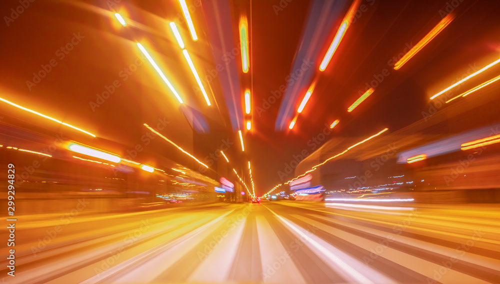 City colorful night lights perspective blurred by high speed of the car. A streak of light, trails.
