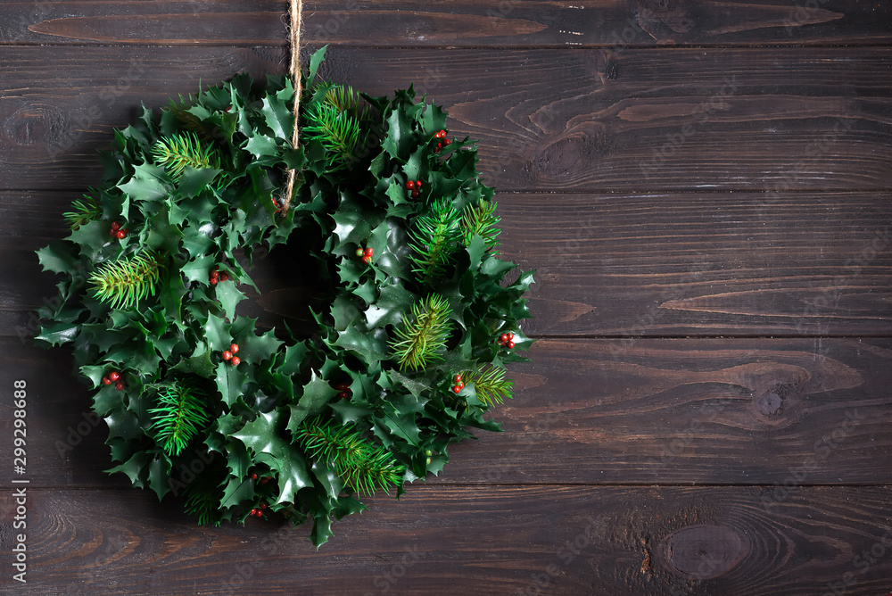 Christmas decoration wreath of green leaves and berries holly ilex plant isolated on dark wooden background. Copy space