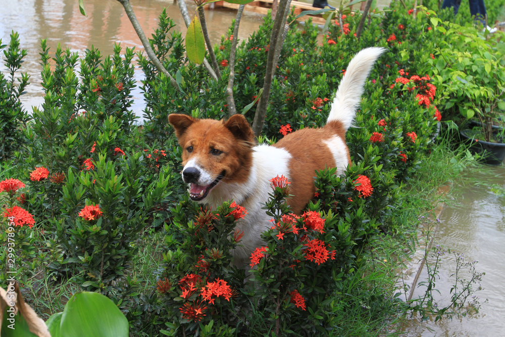 Long tailed adult male vagrant dog colored white and brown walking on small flower gardens around flooding area after heavy raining. Background for natural disaster or animals in the city concept.