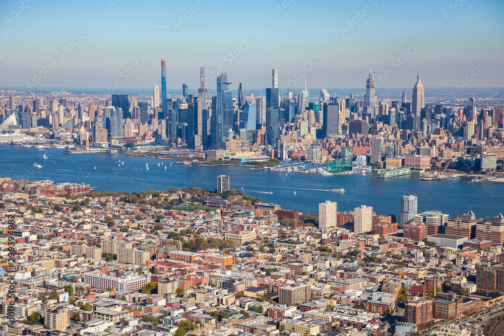 Aerial view to New York City Skyline from helicopter.