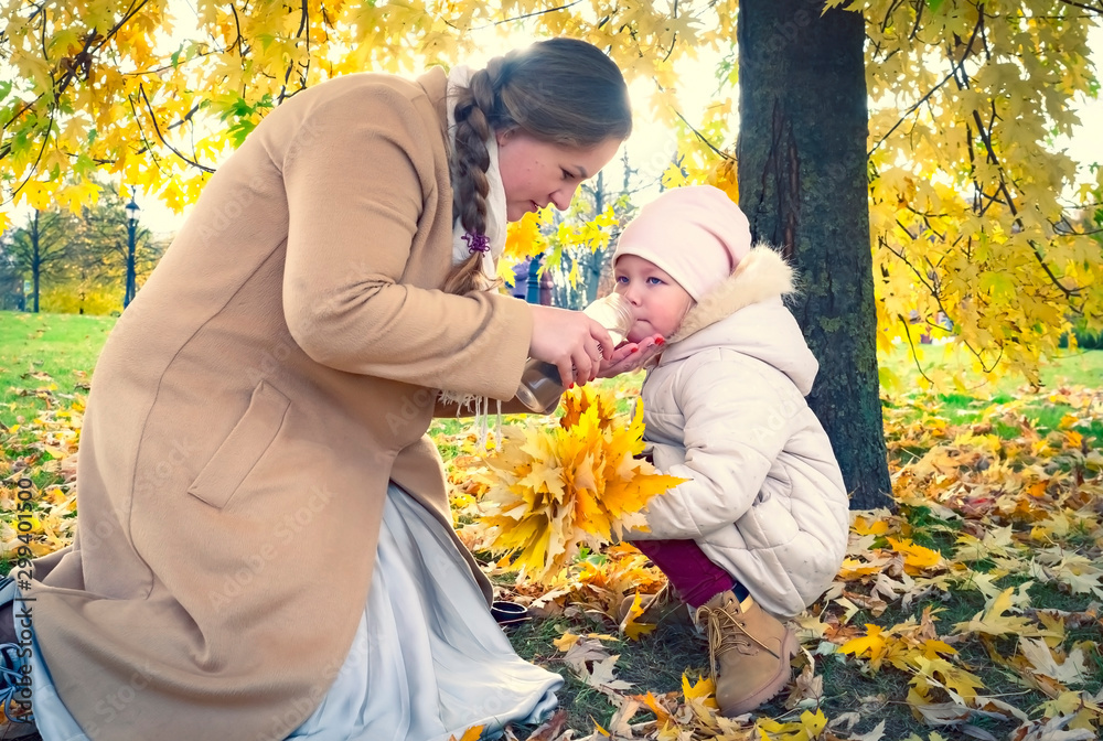 Portrait of a happy mother giving bottle feeding to her baby outdoors. young beautiful girl with a daughter in the autumn park. Walk in the park with yellow leaves.